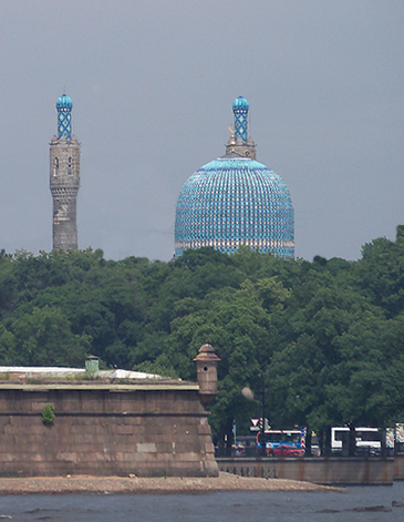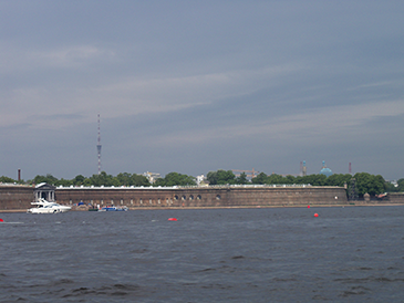 The Peter and Paul Fortress and the Cathedral (same name - the spire in the forground) peeking out from behind the wall. |
